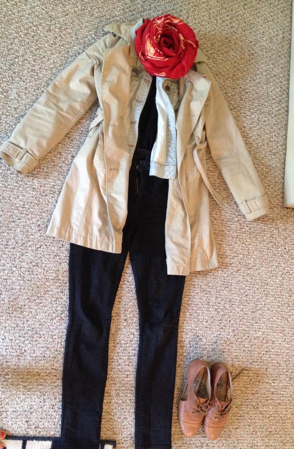 Worn: khaki trench, jean jacket, red scarf, black high-waisted jeans, black sleeveless top, brown leather brogues.