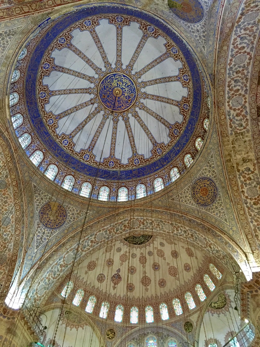 Inside the mosque, it becomes clear why the Sultan Ahmet is commonly referred to as the Blue Mosque. Its walls are covered with brilliant blue handmade tiles, cresting over the beautifully intricate painted domed ceilings inscribed with Qur’anic calligraphy and floral designs. Enormous low hanging chandeliers pool light on the carpets below where worshipers and visitors mill around marveling at the architecture. More light shines through the many stained glass windows- a nod to the Christian architectural influences of the mosque. The beauty of the interior of the Sultan Ahmet is simply breathtaking.