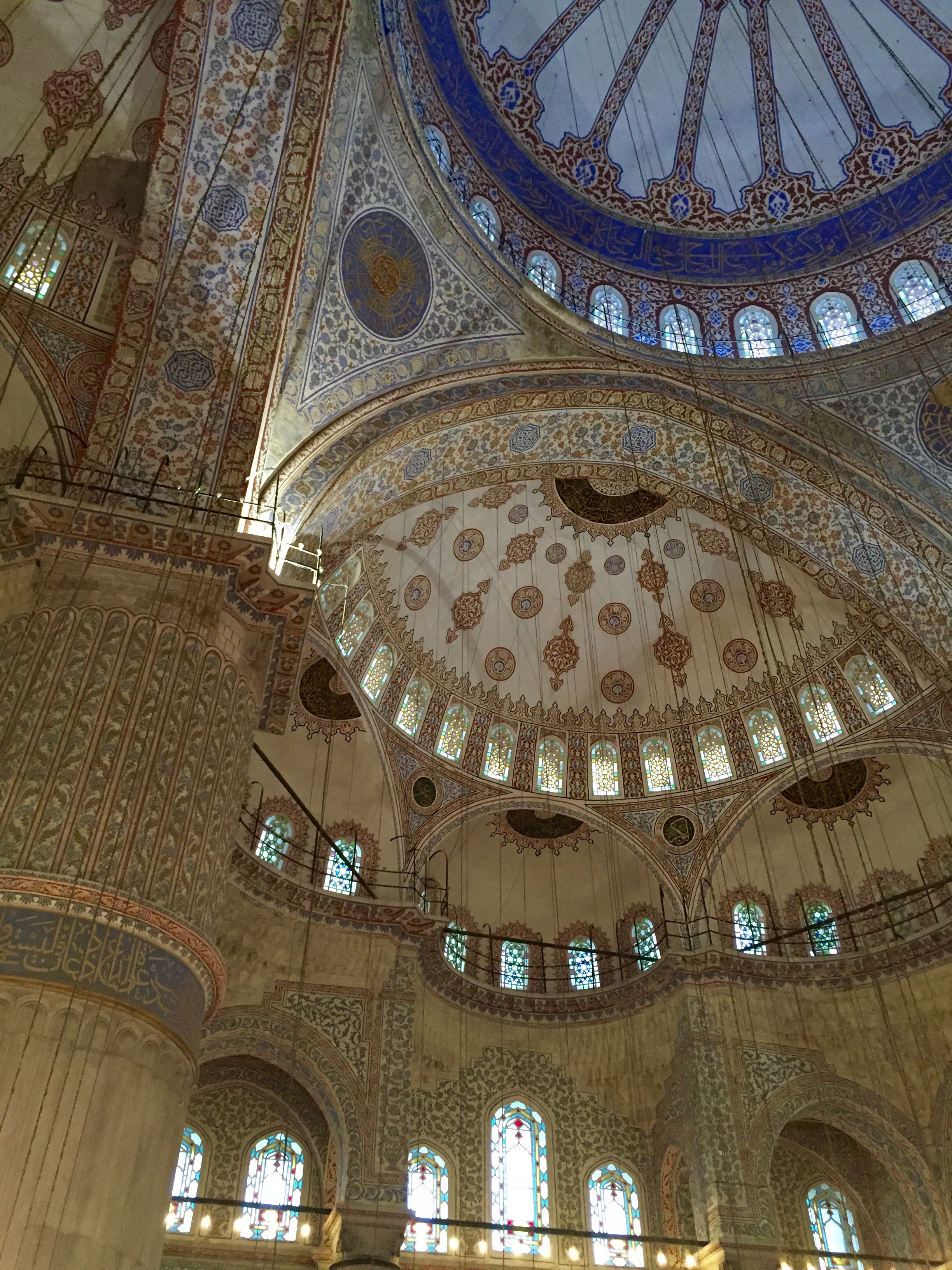 Inside the mosque, it becomes clear why the Sultan Ahmet is commonly referred to as the Blue Mosque. Its walls are covered with brilliant blue handmade tiles, cresting over the beautifully intricate painted domed ceilings inscribed with Qur’anic calligraphy and floral designs. Enormous low hanging chandeliers pool light on the carpets below where worshipers and visitors mill around marveling at the architecture. More light shines through the many stained glass windows- a nod to the Christian architectural influences of the mosque. The beauty of the interior of the Sultan Ahmet is simply breathtaking.