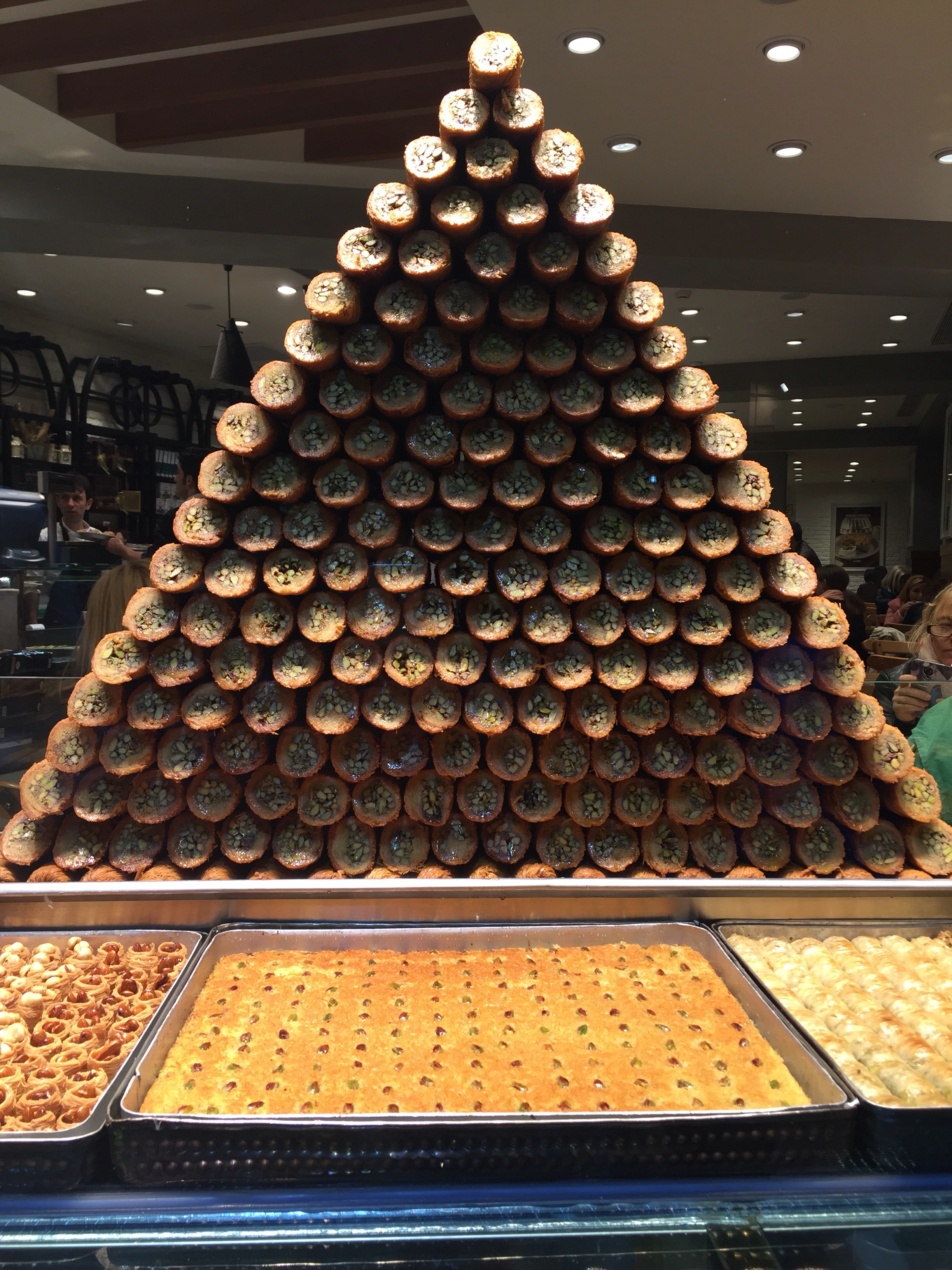 The bright cafe was clamoring with activity even though we went at 11pm in the evening. And by clamoring, I mean, literally clamoring. At the front of the cafe an attendant serve Turkish ice cream, an elasticy dense version of the classic treat, which they dig into and clang inside its metal pot, sort of like a Turkish version of the ice cream truck’s bell. Inside, pastry cases are lined with colorful glistening dessert pieces and a pyramid of baklava rolls is displayed in the front window, beckoning dessert lovers inside.